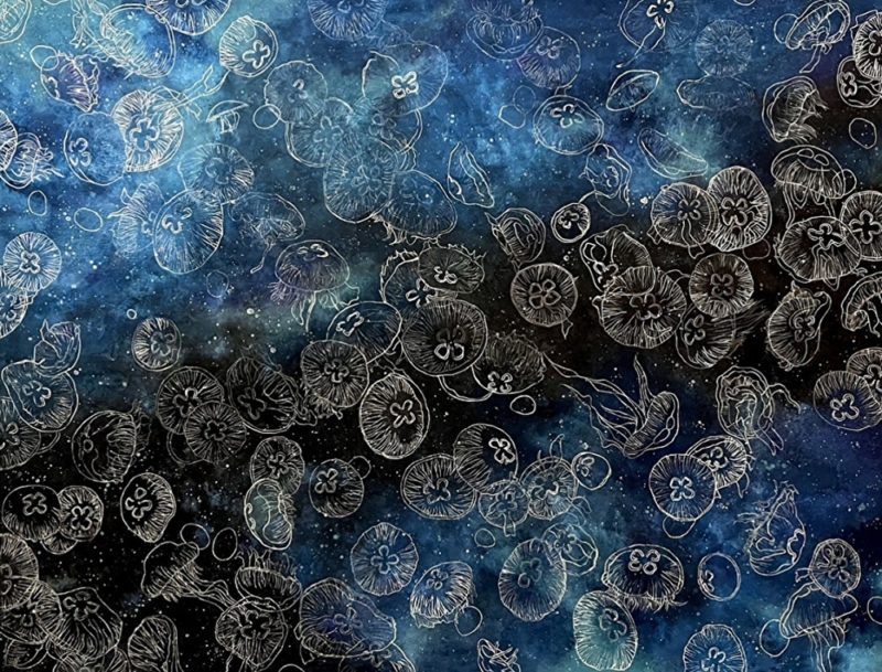 この子はどんな反応するかな、人間たちに紛れ込んで一緒に魚が泳いでるのをじっと見ているかな、など想像して描きました。